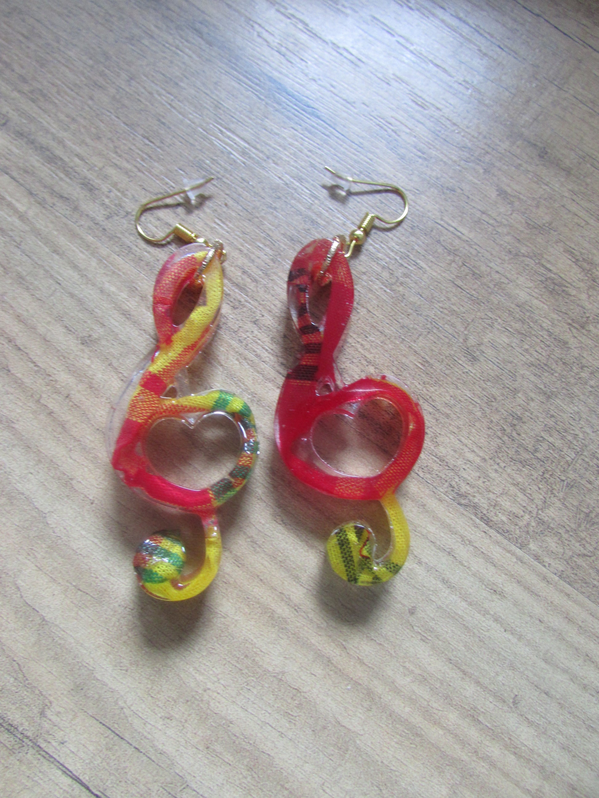 These elegant "Clé de Sol" earrings feature a unique treble clef design crafted from resin epoxy and Madras fabric.
