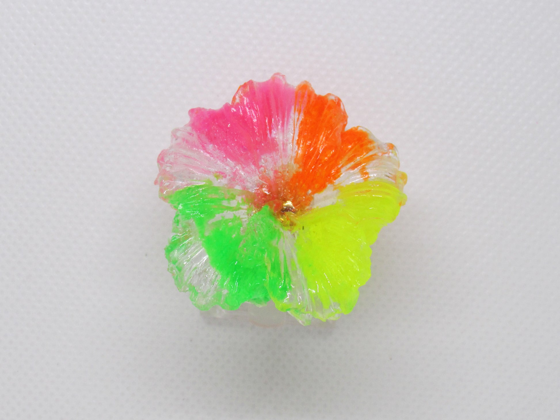 This colourful resin jewelry ring is inspired by tropical hibiscus flowers. Its vibrant green, yellow, pink, and orange colours will add a pop of joy and tropical flair to any outfit.